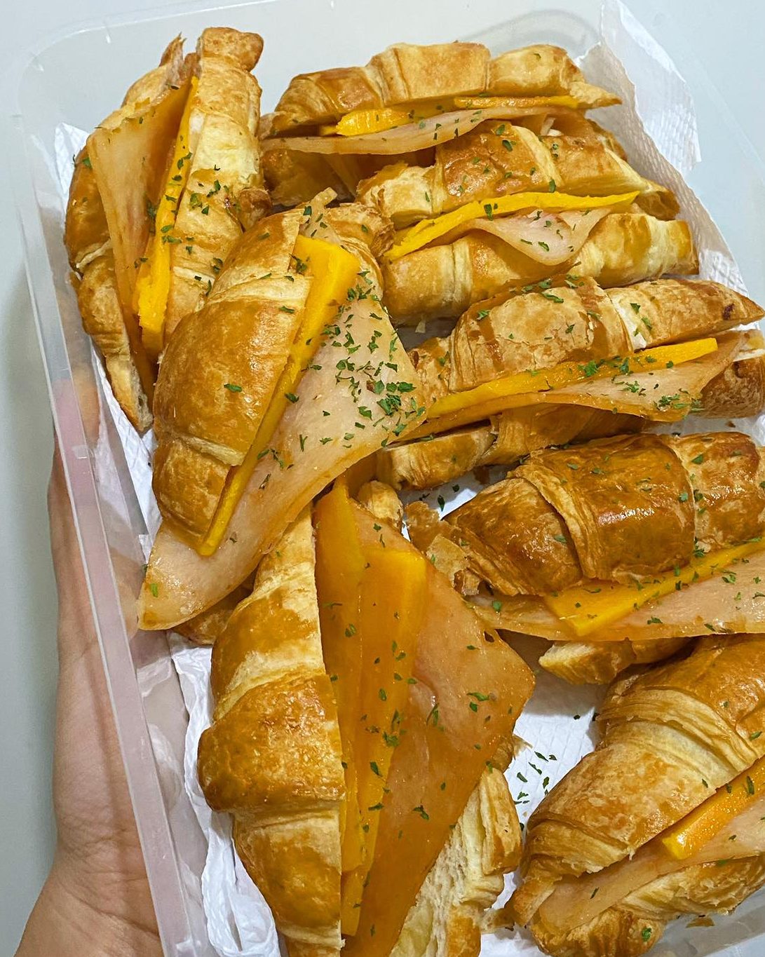 How I prepare my sandwich depends on what bread I’m using. I prefer freshly baked croissants. Simply slice the bread in half, then layer with slices of cheese and your preferred cooked ham (I’m using Chicken Ham by the way). You may pop it in the oven or microwave really quick to melt the cheese, but that’s not necessary. You may also add veggies like tomato and lettuce. If you’re watching your calorie intake, leave out the dressings. It tastes great with just the ham and the cheese!