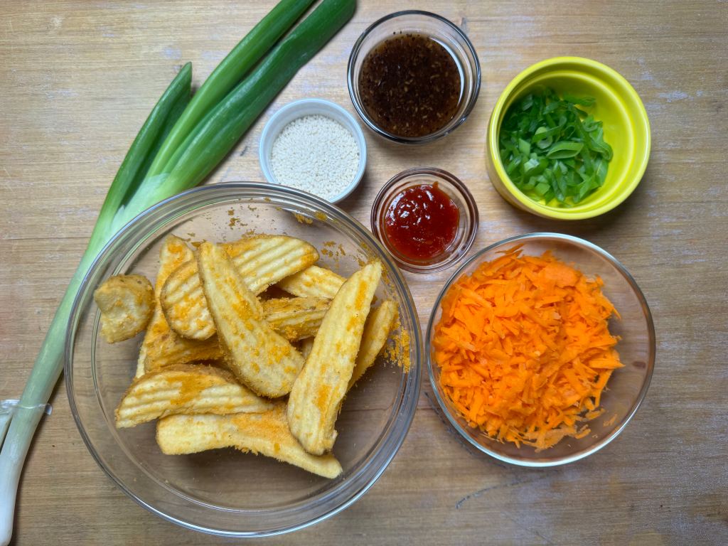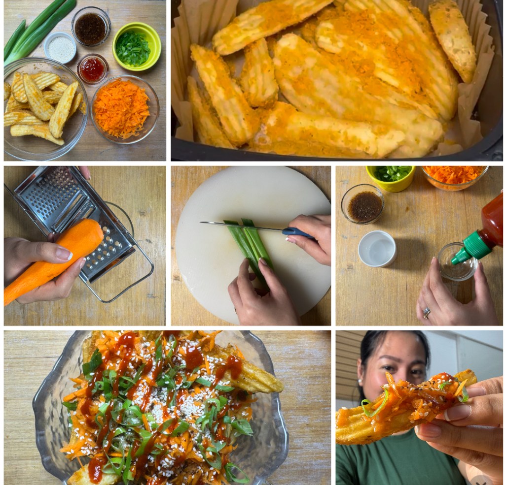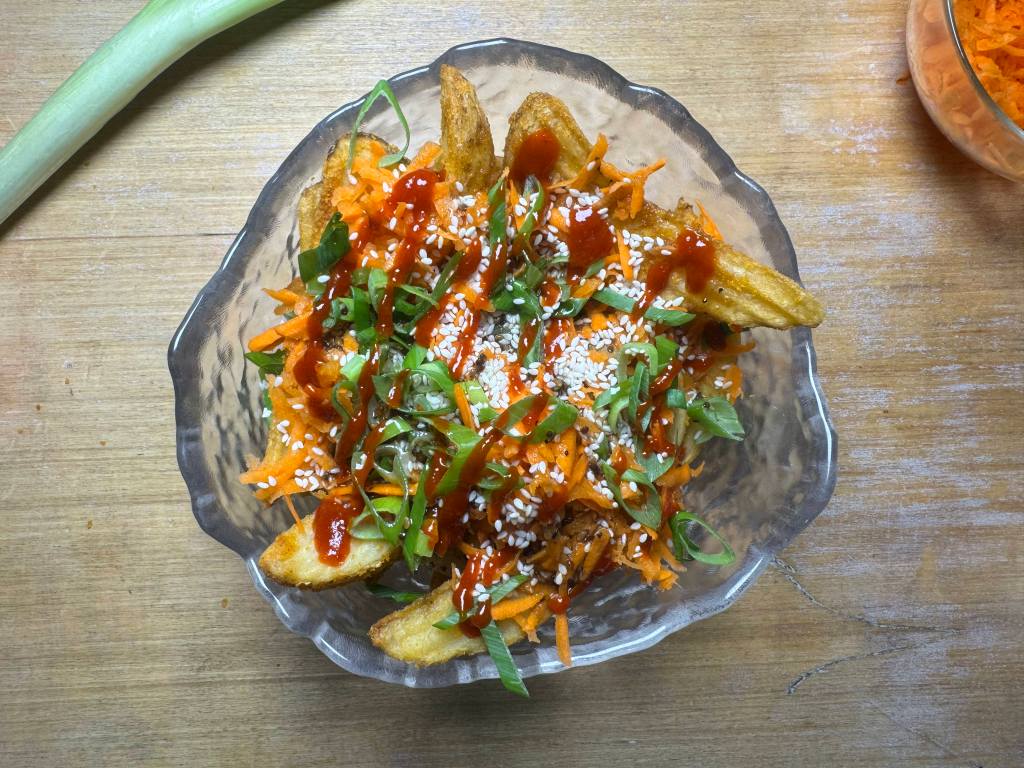 These crispy potato wedges are topped with a vibrant mix of ingredients usually found in Asian cuisine, shredded carrots, sesame soy sauce, and sriracha for that spicy kick.πΆοΈ